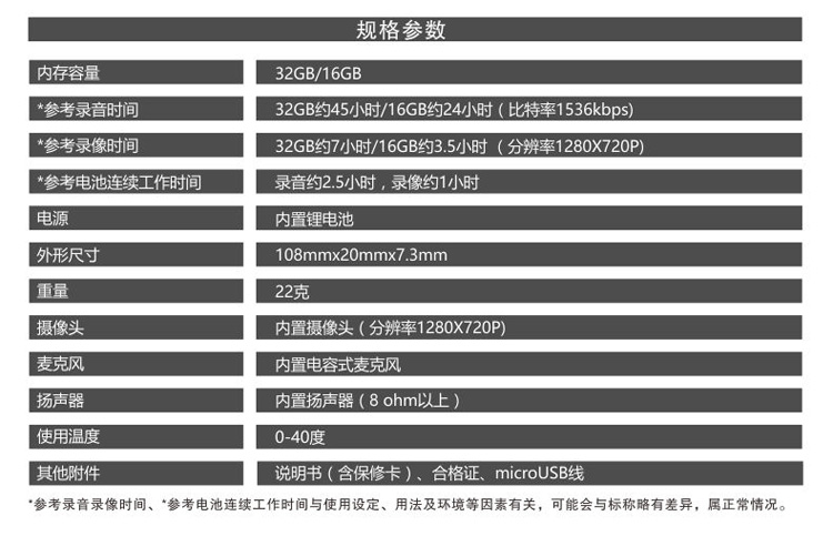 參考電池連續工作時間:錄音約2.5小時,錄像約1小時。(需要更長時