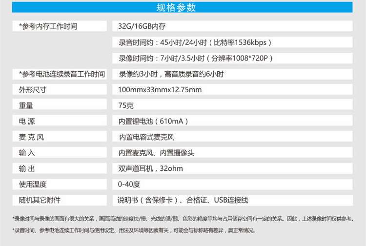 錄像時間約:7小時/3.5小時(分辨率1008*720P)