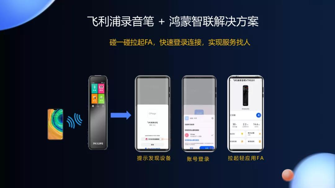 錄音筆作為一個(gè)專業(yè)的錄音設(shè)備,具有錄音清晰、遠(yuǎn)距離錄音、智能降噪等專業(yè)功能,手機(jī)作為一個(gè)綜合的智能終端,具有屏幕大、管理文件更方便、傳輸分享文件更便利等特點(diǎn)。手機(jī)與錄音筆進(jìn)行聯(lián)動(dòng),將極大提高高品質(zhì)錄音的應(yīng)用范圍。錄音筆+鴻蒙智聯(lián)解決方案,手機(jī)和錄音筆碰一碰,就可勁松實(shí)現(xiàn)互聯(lián)。極大降低了以往繁瑣的鏈接步驟。