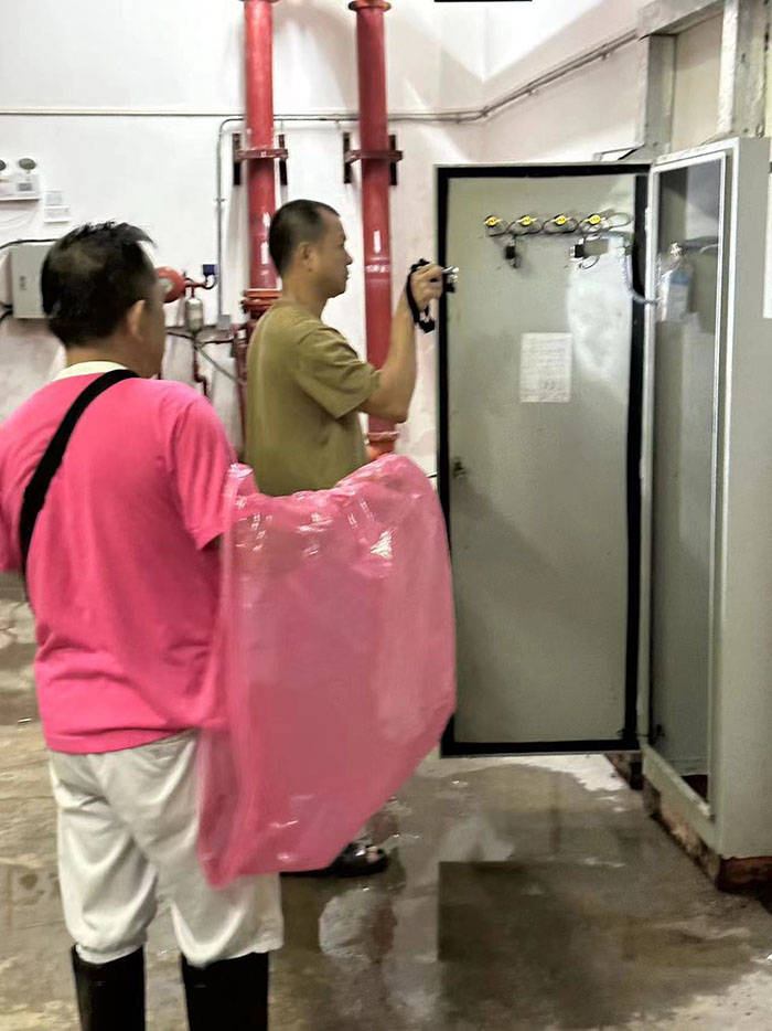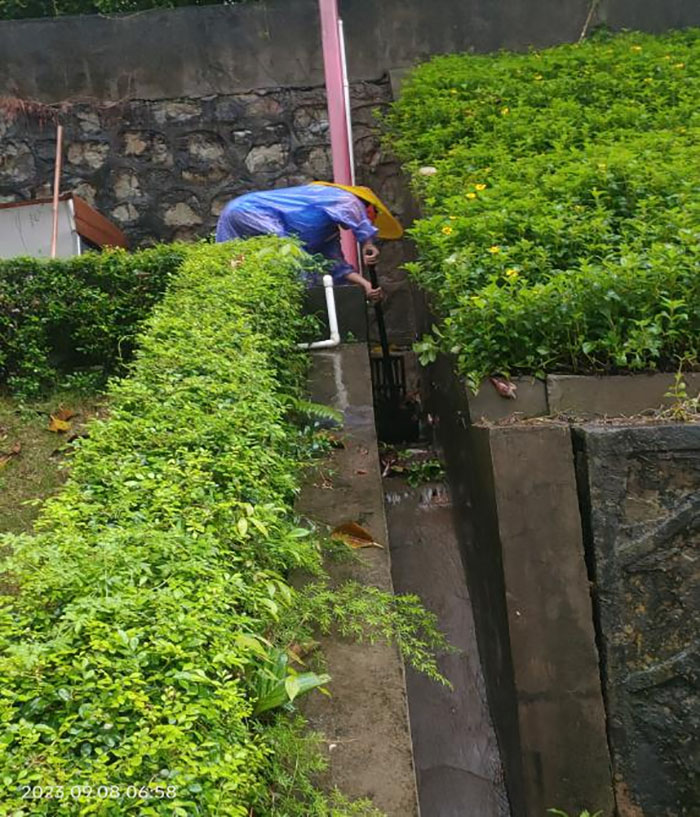京華物業值班干部、工程部、保安人員徹夜未眠、堅守崗位。值班干部在現場迅速決策、高效統籌防汛工作;工程部爭分奪秒排查電力系統,全力維護電力設備的正常運轉,確保供電安全穩定,也為排水設備的運作提供堅強保障;保安人員同樣承擔著繁重的排澇搶險工作,扛沙袋、清洪澇,在防汛一線奮戰不止、忙碌不休。